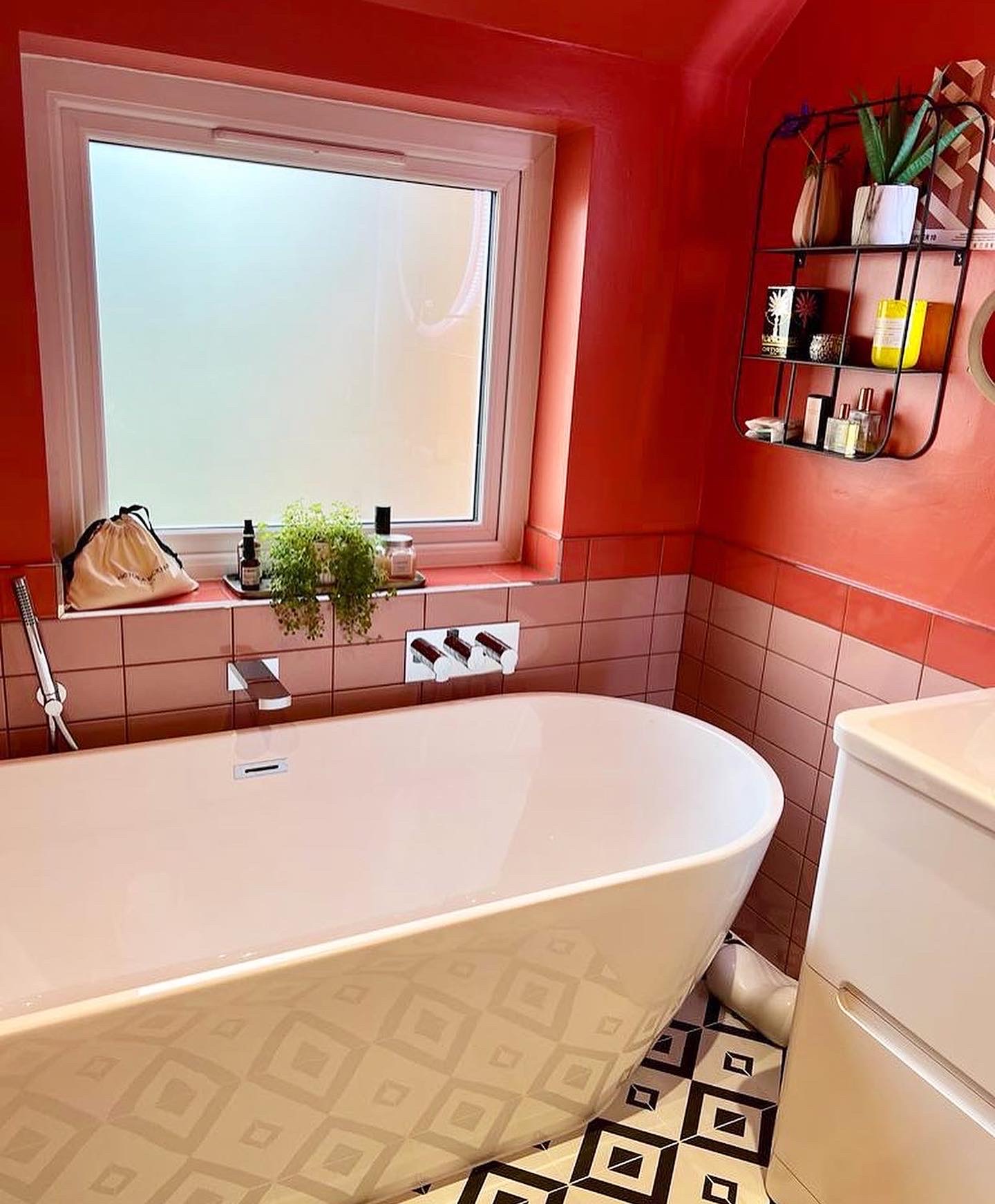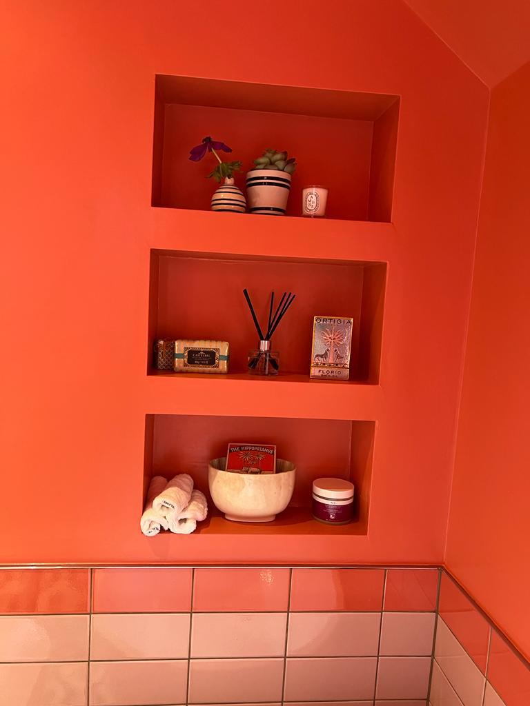 Project: When our client came to us with a very clear inspiration in her prized David Hockney ‘A Bigger Splash” print we knew that bold colour would be on the agenda, so we convinced our client to really commit and include painting the ceiling in this strong coral colour along with the walls. The old bathroom was completely ripped out and the bath repositioned to become the centre piece, we also added the big picture frame window for more natural light in the space.