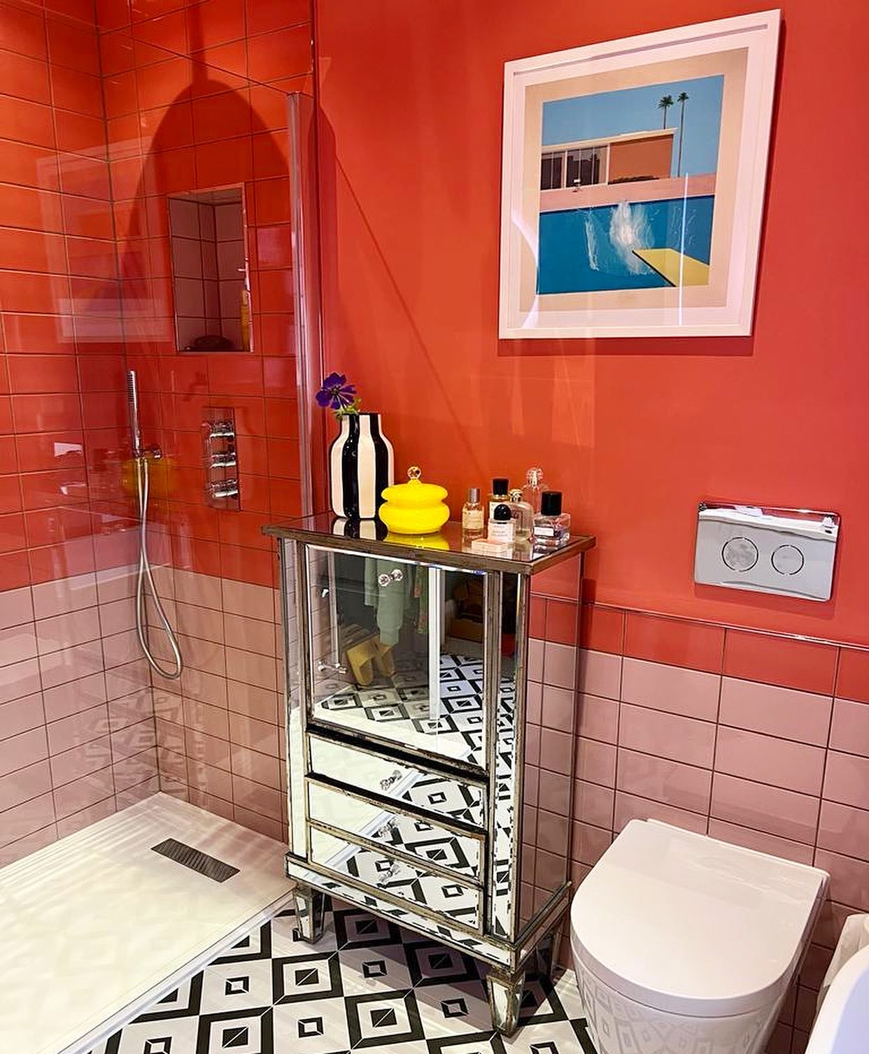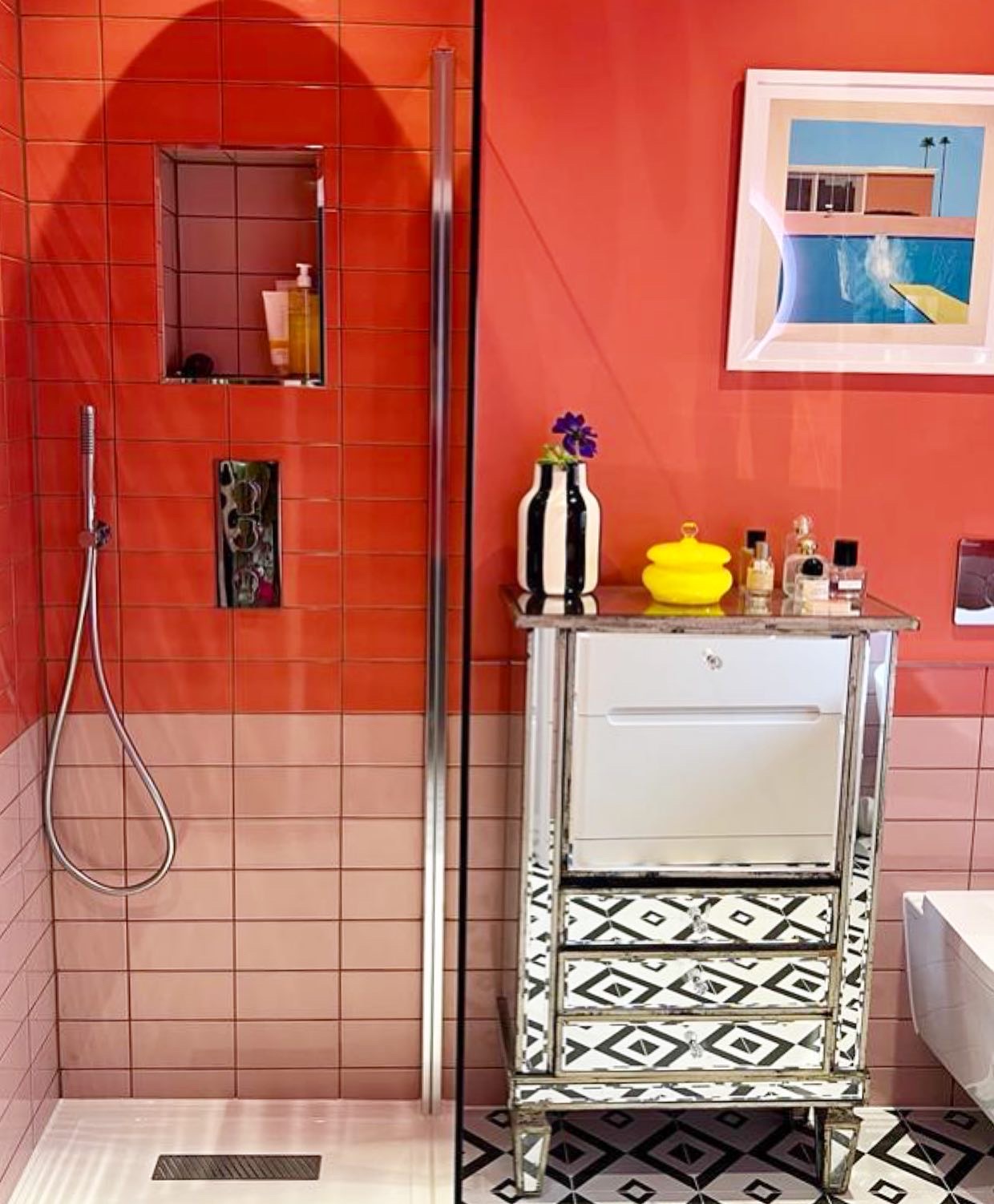 We added in statement chunky built in shelving for styling purposes and re-used the clients stunning mirrored chest for glamour and storage. This bathroom was designed to be a child free, luxurious space for the lady of the house and it suits her fashionista vibe seamlessly.